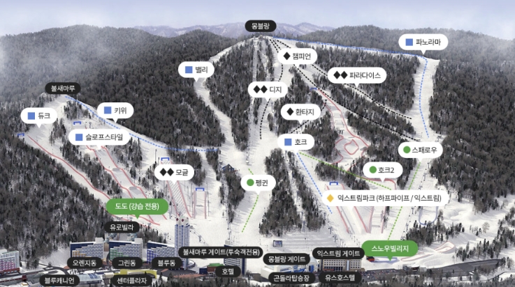 휘닉스파크의 강점은 설질에 있다. 평창 특유의 기후 덕분에 눈이 쉽게 얼어붙지 않고, 미세한 파우더 형태를 유지한다. 이 때문에 스키 날이 눈을 타고 미끄러질 때 충격이 적고, 방향 전환도 자연스럽다. 스키 강습을 받는 초보자들에게 특히 유리한 조건이다. 전문 강사진은 체계적인 교육 방식을 갖추고 있어 단기간에도 방향 전환, 제동, 균형 잡기 등을 익히기 쉽다. 중급자 이상에게는 더 높은 슬로프와 기술적 도전이 기다리고 있다. 가파른 경사에 도전할 때 느껴지는 긴장감은 순간적으로 심박수를 높이고, 그 설렘이 눈과 바람을 통해 몸 전체에 전해진다. 휘닉스파크는 그런 감각적 자극을 적절한 안전성과 결합해 균형을 잡고 있는 리조트다.